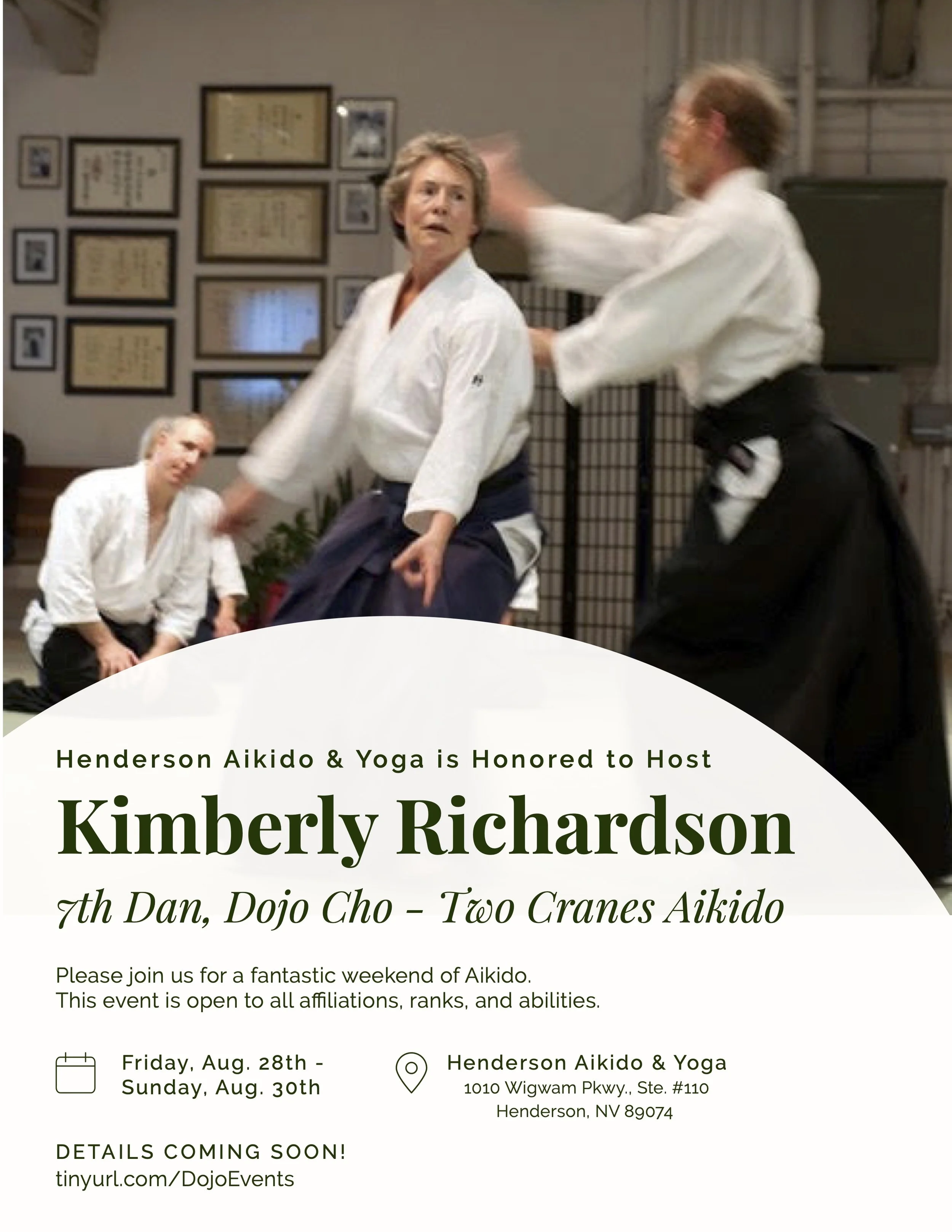 Kimberly Richardson, 7th Dan Friday, August 28, 2026 6:30 PM Sunday, August 30, 2026 12:00 PM Henderson Aikido & Yoga 1010 Wigwam Pkwy., Ste. #110 Henderson, NV 89074 United States (map) Google Calendar ICS Details coming soon!